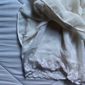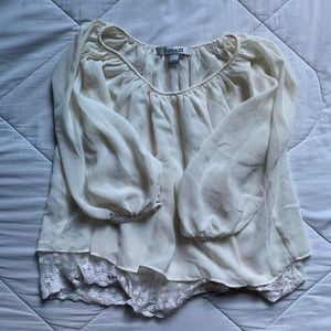 Forever 21 women's cream and white flowy blouse with lace detail, size small. Beautiful top! Lightweight chiffon-like/woven fabric with mesh layer underneath which has lace detailing. Sleeves taper with button at the wrist wit, boxy fit throughout. Dreamy!