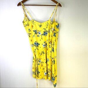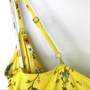Bright yellow floral print. Ties at the waist. Darts at bust for shaping. Adjustable straps.