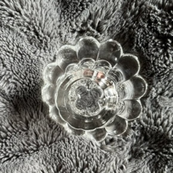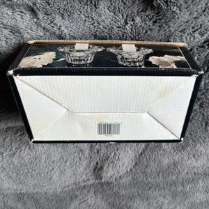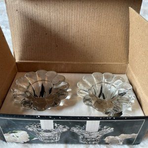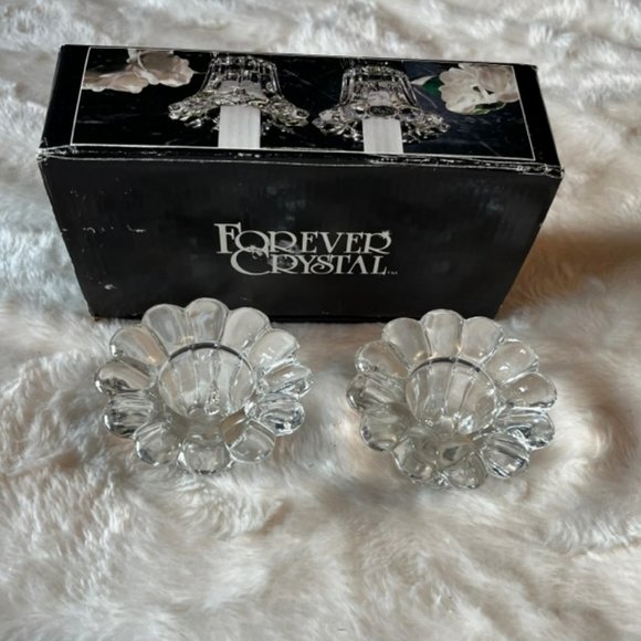 Forever Crystal Candle Holders Clear Flower Petal Shape #315160 brand new in original box. Candle holders have never used, only removed from box for pictures. Approximately 2" high. Does not include candles. Box shows some wear from storage and marks on the bottom of the box. Colour depends on screen settings and lighting in pictures. All measurements are approximate. All items are from my smoke free home.