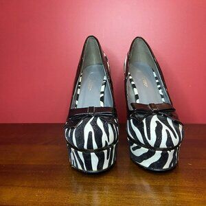 Forever Women's B/W Zebra Print Platform Shoes - Size 7.5 - Great preowned condition! Bow on front. Name: Carolyn-3. Platform height: 1.25". Heel height: 5.5".