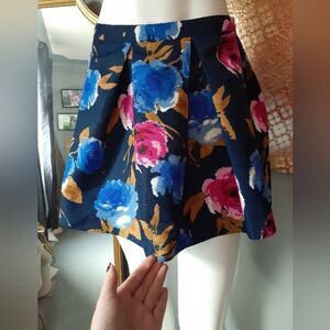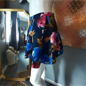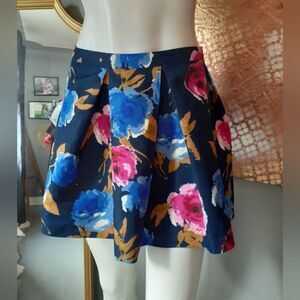 dark autumnal floral full circle mini skirt from Forever 21. pleated detail with side zip closure. fully lined. see pics for material composition. size 27 or size small. see flat lay measurements below!