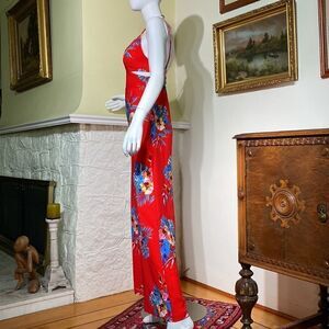 As new, cool Forever 21 tropical print cutout jumpsuit. Bold red background with large colourful floral print, back zipper, adjustable spaghetti straps. Perfect summer outfit, easy to wear all day long.