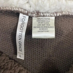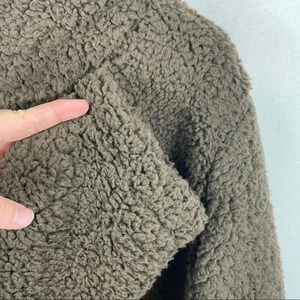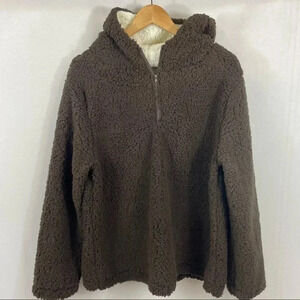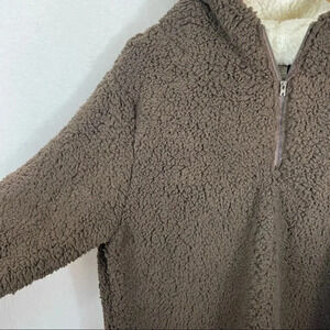 In excellent condition from Forgotten Grace, a cozy and soft faux shearling hooded pullover in a rich chocolate brown. Quarter zip closure. Hooded with contrast faux shearling lining. 100% polyester. Condition: This piece is in excellent condition. Mid-collar to shoulder seam: 10” Sleeve length: 24” Pit to pit: 22.5” Length: 25”