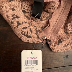 * X-back straps, lace insert, zipper, hook, and eye closure