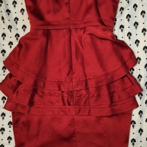This short red dress is an elegant choice for a cocktail party or a wedding (I originally bought it for, and wore it to, my friend's wedding). This strapless beauty can accommodate a modest bust size (32-34 B). It is mid-thigh, or maybe slightly longer, if you are 5' 3" to 5'4" . Size is 0. It has a sheen to it and is best if you steam it vs. ironing (which is why it has wrinkles in the photo- I don't have a steamer handy). You can see a very small amount of wear on the front of the dress, and I've attached zoomed in shots to identify these areas. This is from storage with clothing that had embellishments which rubbed/caught against the fabric of the dress a bit. They are not noticeable. I've worn this dress, I think 3-4 times max. It is in very good condition.