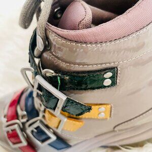 Light grey ankle boot with evergreen, red, and yellow straps.