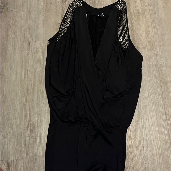 Elegant black sleeveless jumpsuit featuring gold accents on the shoulders. Perfect for a night out.