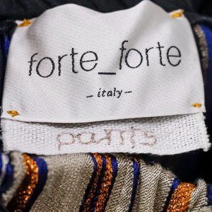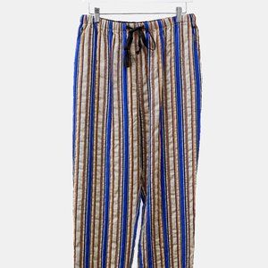 From their 2019 Resort collection, Forte_Forte’s 6021 pants in a jacquard striped pattern in blue and ecru with copper lurex yarns. These pants feature an elasticated waistband with a drawstring closure, faux fly, inseam front pockets, a single rear welt pocket, and a relaxed silhouette with a tapered leg.