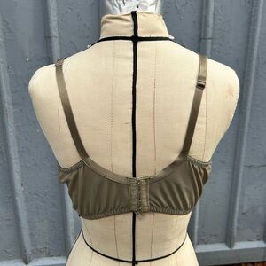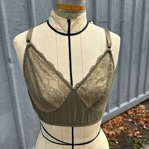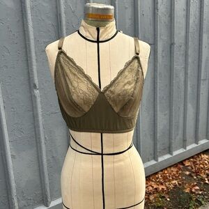 The Ivy Longline is a wire-free bra, fusing Olive Green Italian Jersey with black, botanical motif scalloped lace and power meneful seaming and an extended band offers excellent structure and support. Made in Toronto, Canada