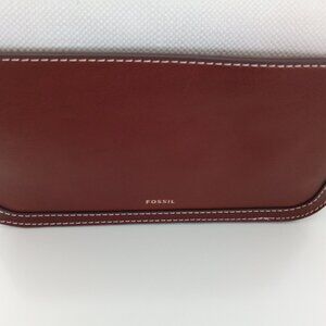 Inside: Brown polyester lining, zip pocket on back wall with Fossil signature leather logo and a slip pocket on front wall.