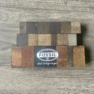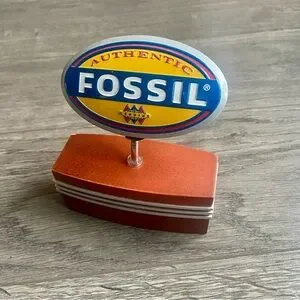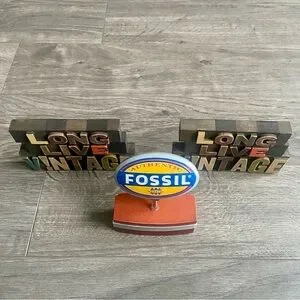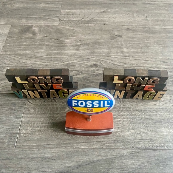 Colorful Fossil authentic sign decor. Perfect for adding a vintage touch. Vintage watch store display circa early 2000’s. Measurements in images. Material metal and wood