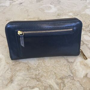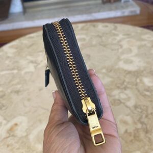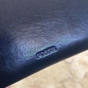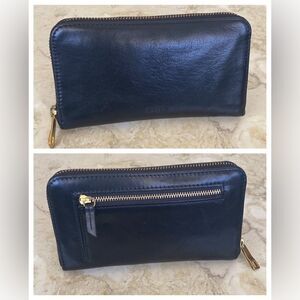 In excellent preowned condition classic, simple and elegant black leather zippered wallet from Fossil.