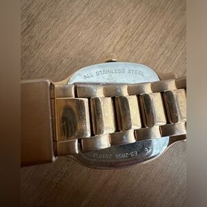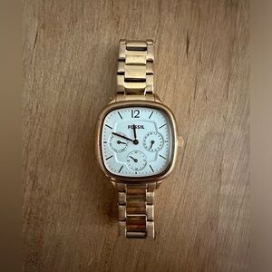 Fossil brand watch. Rose gold metal. Square shaped face. Needs a new battery. Has some wear on the metal band as shown in the photos. Gorgeous colour and unique face shape. The band size can be adjusted by removing links. Approximately 7.5” total length.