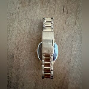 Fossil brand watch. Rose gold metal. Square shaped face. Needs a new battery. Has some wear on the metal band as shown in the photos. Gorgeous colour and unique face shape. The band size can be adjusted by removing links.