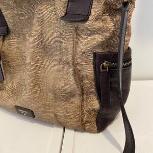 Item keywords: Fossil Brown & Tan Crossbody Tote Bag With Zipper Pockets Fossil bag, crossbody tote, leather accents, brown tan bag, adjustable strap, zipper pockets, Fossil tote, handbag, everyday bag, casual tote, stylish bag, Fossil accessory, fabric bag, versatile purse.