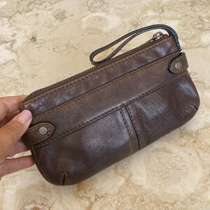 In excellent preowned condition Fossil brown leather wristlet / clutch bag. Featuring an exterior zippered pocket, main compartment is zippered with a cloth lined interior that is totally clean. Interior has a zippered pocket. Heavy duty silver tone zipper pulls.