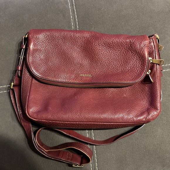 Elegant Fossil crossbody in burgundy leather. Features adjustable strap and zip closure. Perfect for everyday use.
