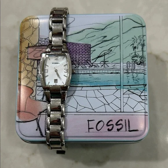 Stylish - pre-owned Fossil watch with a solid silver band. Features a rectangular face. Ideal for everyday wear. Comes with original storage box. Open to offers