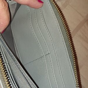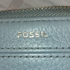 Elegant Fossil wallet in gray leather. Features a chic black tassel. Several card slots, two large areas for bills on each side and zipper compartment for change.