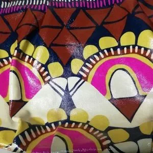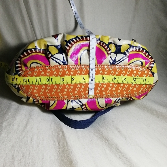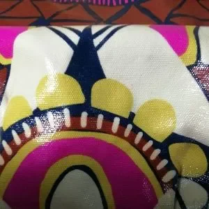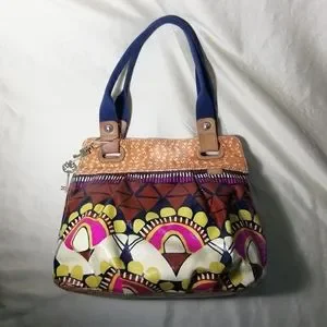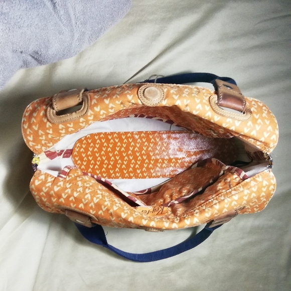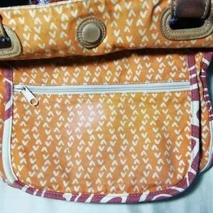 Fossil bag made of canvas, coated canvas and leather. Some loss of collor on the orange canvas due to a too agresive cleaning. I washed it by hand with soap, water and a brush, and then I put it in the washing machine as well, so it's as clean as it gets.