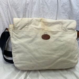 This bag is in good condition, with a fully adjustable strap, leather accents, and a cool print on the front. This has multiple pockets—two on the outside, and on the inside, there are two compartments, one padded for a laptop and the other with one zippered and two cellphone pockets. There is a bit of staining on the white canvas, but that just adds to the character of this cool bag.
