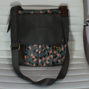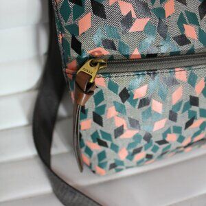 Fossil Morgan North South Leather Geometric multicolor Large Traveler Messenger Bag Two front pockets with snap button closures Zipper pocket on one pocket Large zipper pocket on front Open pocket on back Two interior pouches and interior zip pocket Detachable adjustable crossbody strap Coated leather geometric print 14” L x 3” W x 12”