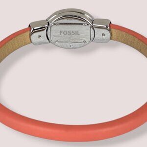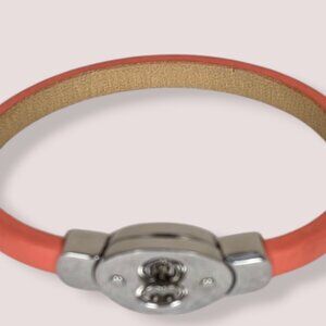 This bracelet by Fossil is made with stainless steel and a leather band with a beige interior and an orange exterior. The bracelet has a round clasp with a turning lock and key-like mechanism. The back of the clasp says FOSSIL in the center and STEEL in small letters above it. The bracelet has some wear, including small superficial marks in the metal, but it is in good condition overall.