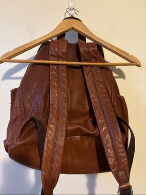 Stylish brown leather backpack designed for everyday use. Features multiple exterior pockets for organized storage. Durable leather construction with secure buckle and zip closures. Comfortable straps for daily carry. Classic brown color complements casual and professional outfits.