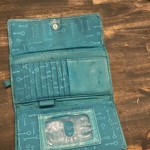 Stylish teal leather wallet by Fossil. Includes card slots and ID window.
