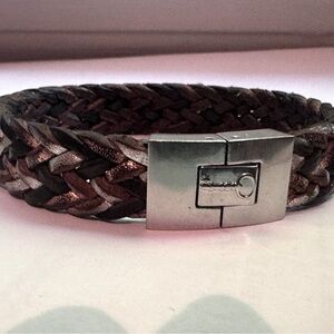 Give your wrist some instant attitude with this stylish Fossil multi-tone braided leather bracelet! Featuring a mix of black, brown, and taupe leather, it’s the perfect blend of rugged + refined. Finished with a bold stainless steel magnetic clasp, this piece is as secure as it is sleek.