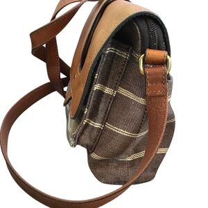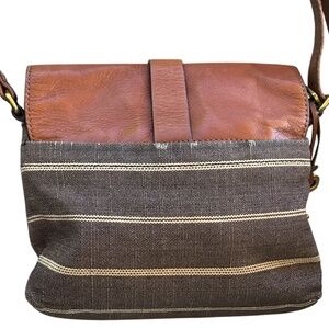 Vintage Fossil crossbody bag with a pebbled tan leather flap, grey and white striped fabric body, inner black fabric lining and brass hardware.