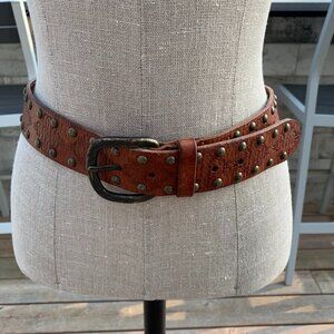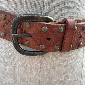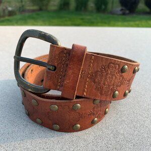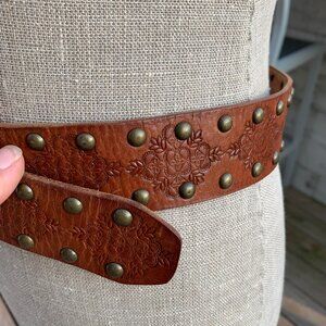 Fossil Vintage Y2K Tooled Brown Leather Brass Studded Boho Waist Belt