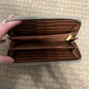 Zip up Fossil wallet. Grey, cream, white, and black color’s with gold zippers. Slight discolouration on front (see last picture). Good used condition. All zippers work great, however the front zipper pull has fallen off before but you are able to put it back on. Lots of card slots and room for cash.