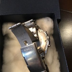 Silver with stones around the bezel. Good used condition. Large face. Needs a clean and new battery but otherwise is good working shape.