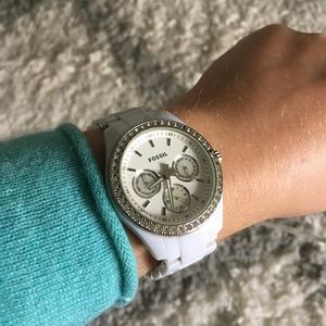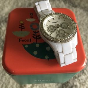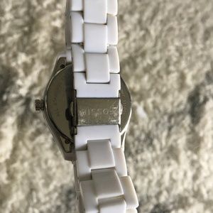- Round white acetate case with crystal detail at bezel; silver-tone satin dial with Arabic numerals