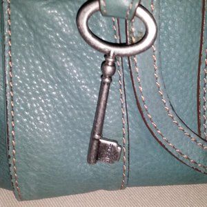 Fossil green long live vintage 1954 leather satchel. Decorative key attached on front. Front pocket. Zipper closure with two interior open pockets and one zippered.