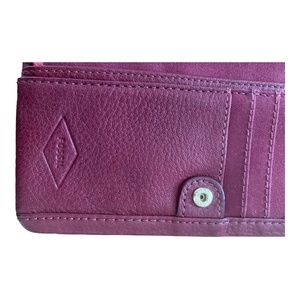 Fossil leather wallet. Coral Pink & burgundy with gold hardware. Zippers & snaps work great. Lots of space in this wallet. Hold an iPhone 11