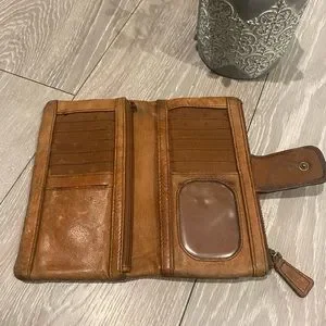Well loved fossil wallet Has lots of life left in it Missing the zipper part (please see pictures) still zips!!