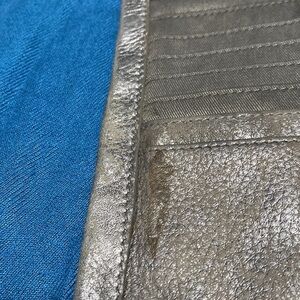Good condition Fossil wallet, has a distressed look overall and one spot inside appears worn as pictured. 2 change zip up sections, button closure. Soft leather.