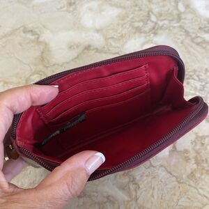 In very good preowned condition lovely and colourful coated canvas and leather wristlet style small wallet from Fossil. Quality brass zipper and hardware and very clean interior with 4 credit card slots.