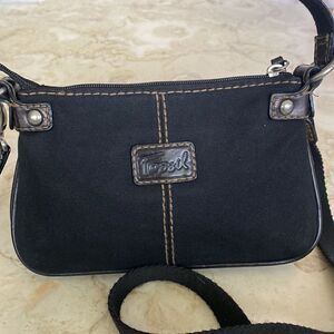 Lovely vintage Fossil mini bag in black leather and canvas. This bag is in excellent preowned condition and features a carry handle plus a detachable shoulder strap (non adjustable).