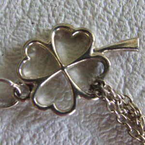 About 1" clover with strands of silver chains attaching to the toggle closure