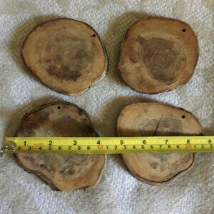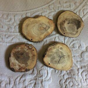 Good condition four wooden rustic trunk coaster set with bark still intact. Could use a sand and then some wood oil. I may or may not get around to doing this and will update pics if so.