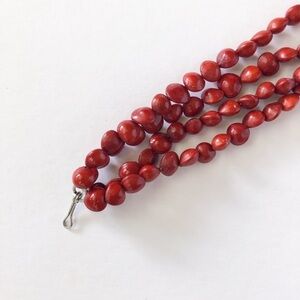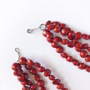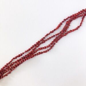 Red seed beaded necklace, with four strands. Measures approximately 18 inches long or 9 inches in length when worn. In good condition.
