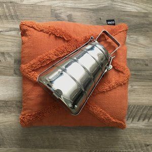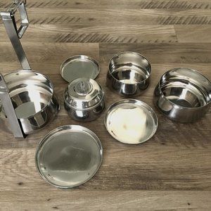 Very good preowned condition Tiffin box/Dabbawala. A unique shape with secure locking features and a handle for mobility. Great for any type of storage.