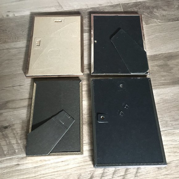 Very good preowned vintage condition lot of four metal frames in silver, gold and faux wood. Each are roughly about 7" x 5" (See photos for specific measurements), two include mounting and one is 4" x 6". Great for an art show display, or else a little shrine or theme on one's wall. One of them (upper right) has a tiny chip taken out of one edge of the glass that is not visible from the outside and doesn't seem as if it will continue to crack (please refer to last photo). I have had these frames for a while and it has never been a problem. Real artwork! Not generative or stolen.