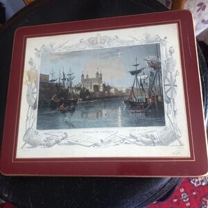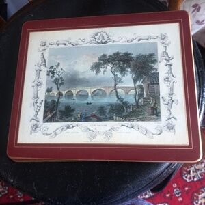 Four vintage pimpernel cork like placemats, made in England - used good shape. I have a set of these placemats for my wood table to protect the wood, they work great, A quick wipe down , let dry and stack. These ones display a beautiful scenery and always nice to look at it.