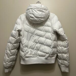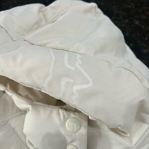 Has a hood and 2 zippered front pockets, zips and buttons up the front