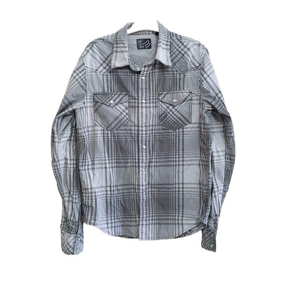 Fox Racing Western Shirt Mens Size Medium Gray Plaid Pearl Snap Long Sleeve