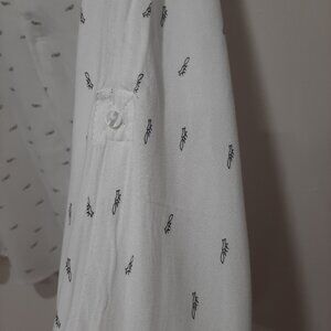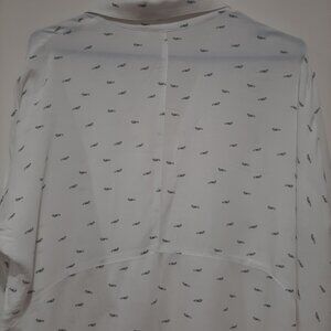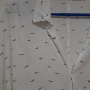 Purchased at a boutique in Montreal. Fell in love with the cute fox motif even though it's a bit big on me. It's made in Montreal (see photo) so its a slow fashion ethically made blouse. It has a high low curved hem and really elegant seams on the back. There is a slit at the side. I removed the tag, but it was tagged as a medium but fits big so would fit large too. You can style it a lot of ways and looks so chic!